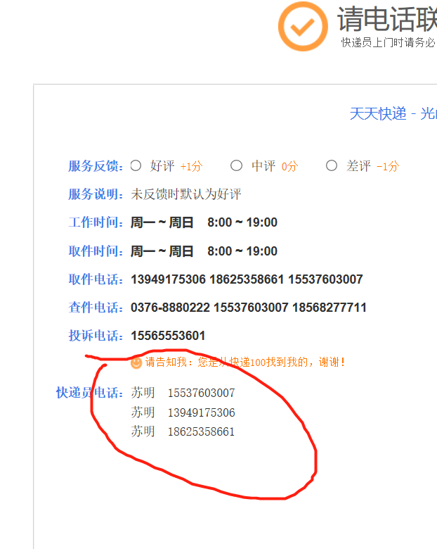 天天快遞公司光山分布的聯(lián)系方式有誤,15537603007這個(gè)手機(jī)號(hào)已換人,請(qǐng)刪除該信息,以免產(chǎn)生糾紛